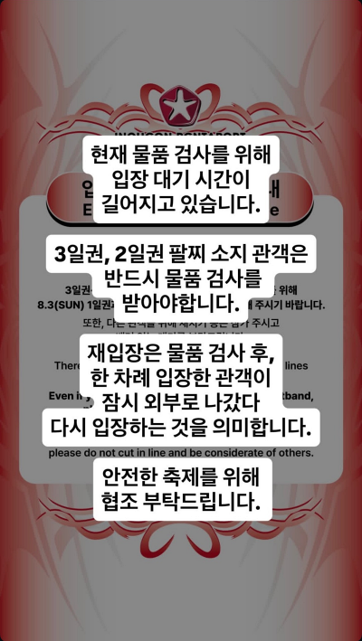 재입장 관객들이 이상한거 갖고 다시 들어오면 안되니까 들어올 때마다 짐검사를 다시 해야하는건 맞는데.. 그러면 경로를 조금 다르게 운영하는건 안되는 거였나 싶고 통로가 작년보다 좁아진 와중에 사람들이 한꺼번에 와르르 모여서 어쩔수 없나 싶기도 한데.... 그렇게 정체가 시작된 후로 물품검사까지 통과하니(웃긴게 물품검사는 또 졸라 대충함..) 거의 40분이 지나버렸더라 근데 나는 좀 빨리 들어온 축에 속하는 것 같고 한시간 한시간반 넘게 기다려서 들어온 사람도 있었다는 듯...